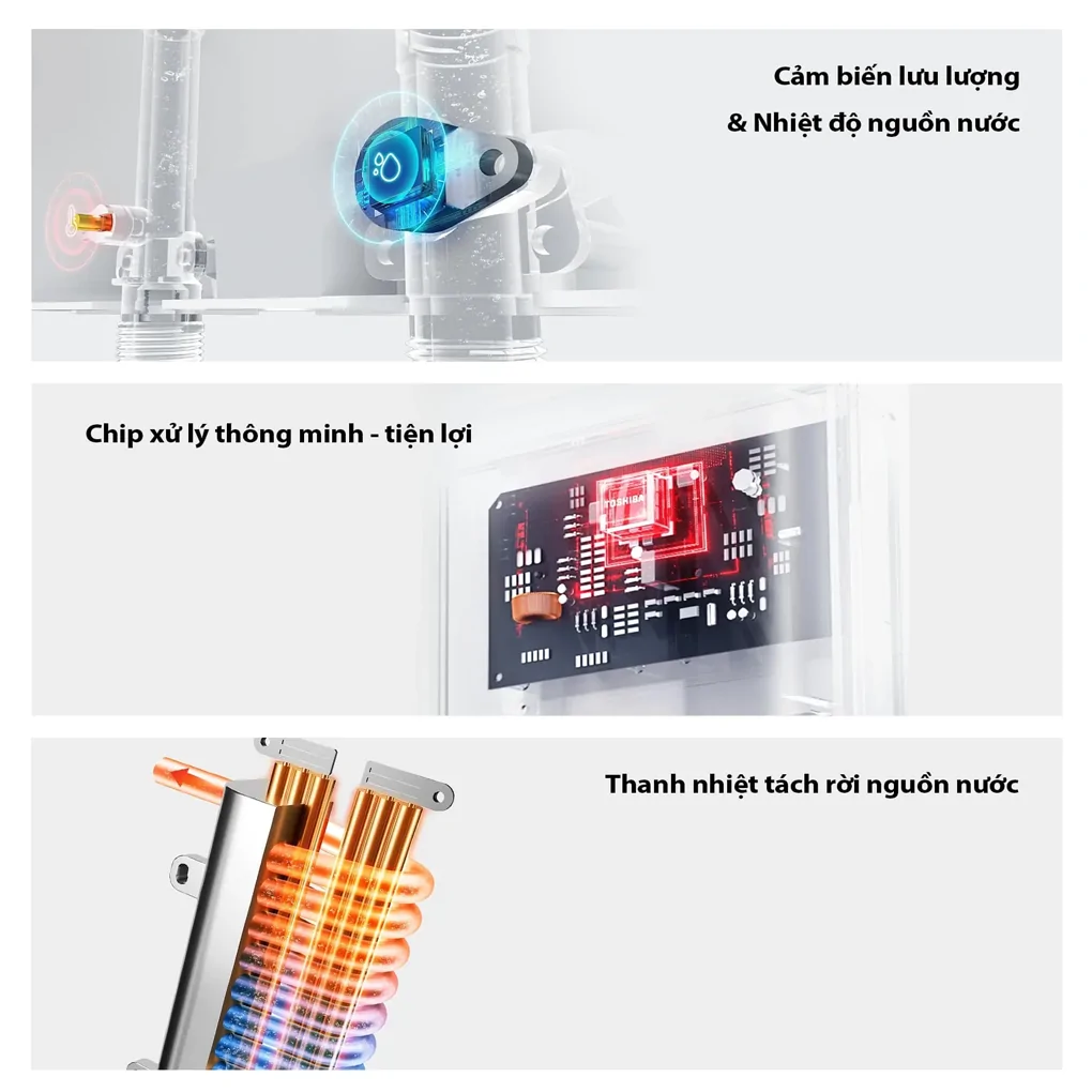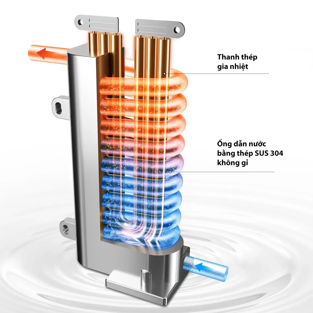 Thiết kế này vừa tiết kiệm điện năng, vừa giúp người dùng tận hưởng dòng nước ấm dễ chịu mà không phải chờ đợi lâu – lý tưởng cho những buổi sáng vội vã hoặc sau một ngày dài mệt mỏi.
