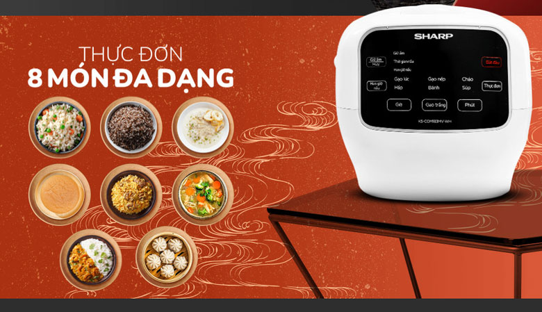 Nồi tích hợp 8 chương trình nấu thông minh, bao gồm gạo trắng, gạo lức, gạo nếp, cháo, hấp, bánh, súp và giữ ấm. Mỗi chế độ nấu đều cài sẵn thời gian và nhiệt độ, giúp người dùng dễ dàng thao tác.