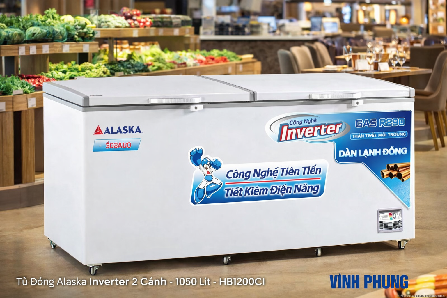 Tủ đông Alaksa Inverter 1050 lít HB-1200CI mang đến không gian lưu trữ rộng rãi, đáp ứng nhu cầu bảo quản thực phẩm số lượng lớn cho nhà hàng, siêu thị và kho lạnh.
